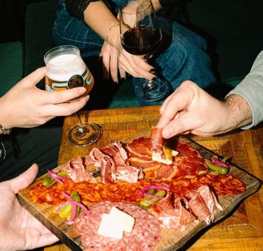 Les verres s'accompagnent d'assiettes à partager : burrata, houmous, camembert rôti, planches... des incontournables revisites, pensés pour être dégustés ensemble.