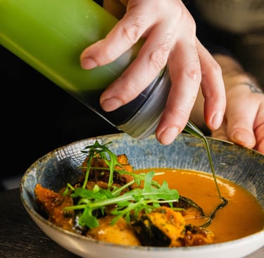Le midi, Bacchus propose une cuisine de saison, pensée pour le déjeuner et renouvelée chaque semaine au fil des arrivages et de l'inspiration du chef.
